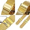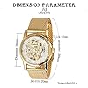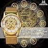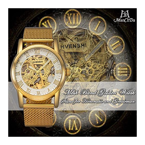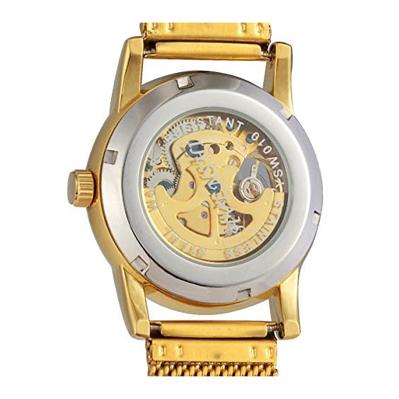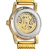 Golden-tone dress watch with golden Milanese strap featuring skeleton dial