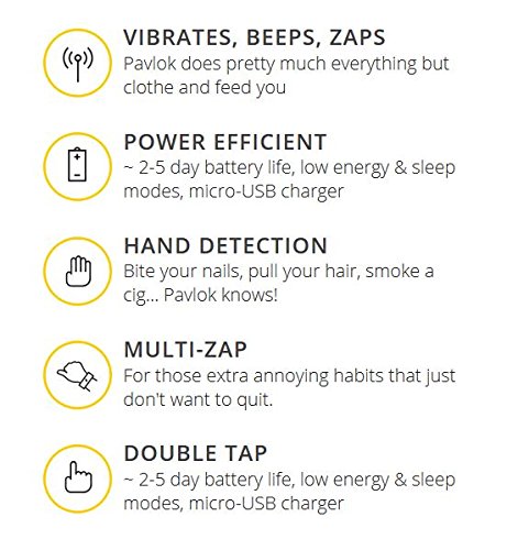 Behavioral Technologies Group product is a wearable device that helps you break any bad habit. Pavlok combines proven behavioral training techniques, innovative “zaptic” hardware, and tracking software to help you kick habits like smoking, nail biting, eating sugar, being unproductive, hitting the snooze button, and more.