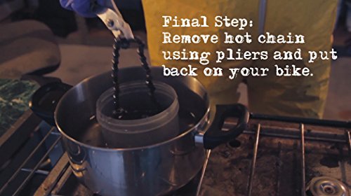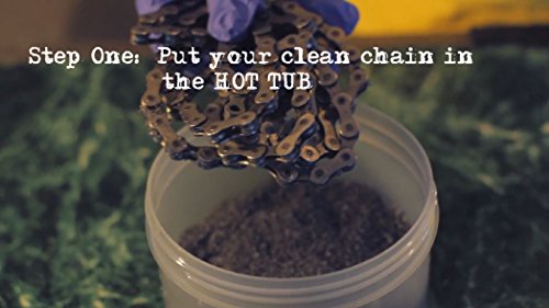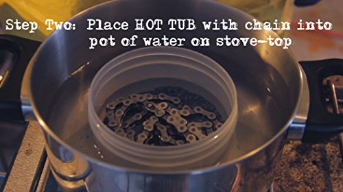 melted paraffin wax lubrication treatment. You no longer have to melt wax in a slow-cooker or risk ruining a nice pot. Simply put your chain in the HOT TUB and heat the entire container in a water bath on your stove. With our combination of paraffin and other lubricants, your chain will be the cleanest and quietest it can be. People have attempted to get the same lubrication as paraffin with messy wet squeeze-bottle lubricants, but none come close to the real thing.