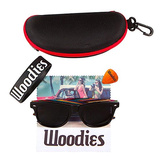 Woodies Rainbow Wood Sunglasses with black, polarized lens offer a combination of 100% Rainbow Wood arms that support a wayfarer style plastic frame. The lightweight wood offers a comfortable fit that is durable and sturdy at the same time. Our unique stainless-steel, double-spring hinges are sturdy and designed to keep their shape year after year. The lenses are specially designed so that they are both dark and polarized, offering 100% UVA/UVB protection even in intense lighting conditions. These glasses are stylish, durable, and natural. Each pair includes a durable black carrying case, a microfiber lens cleaning cloth and a wood guitar pick! 30-Day Money back Guarantee